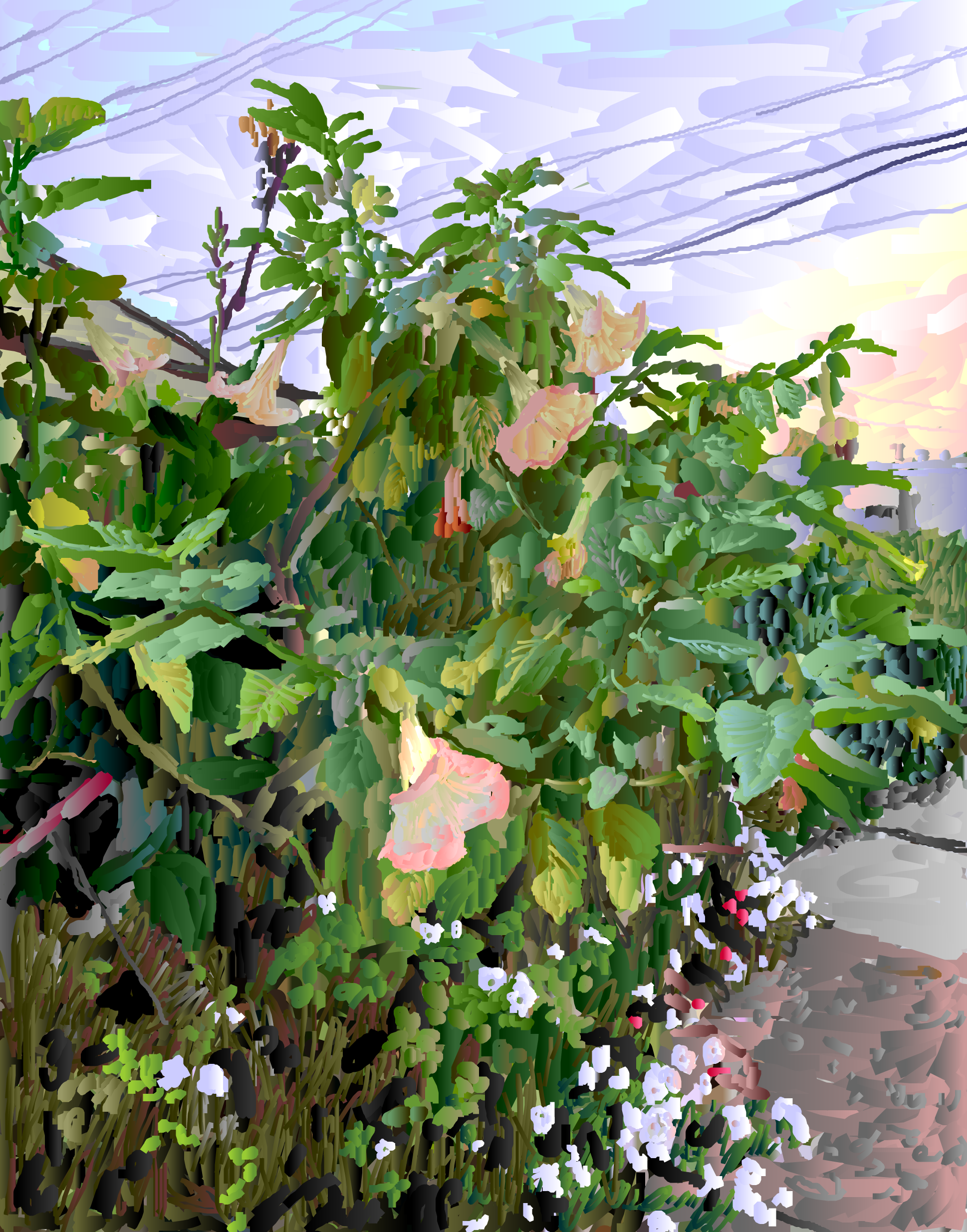 The composition began as a cell phone photo, then transformed through deliberate mark-making that captures both the plants' delicacy and the subtle interplay of light and shadow.