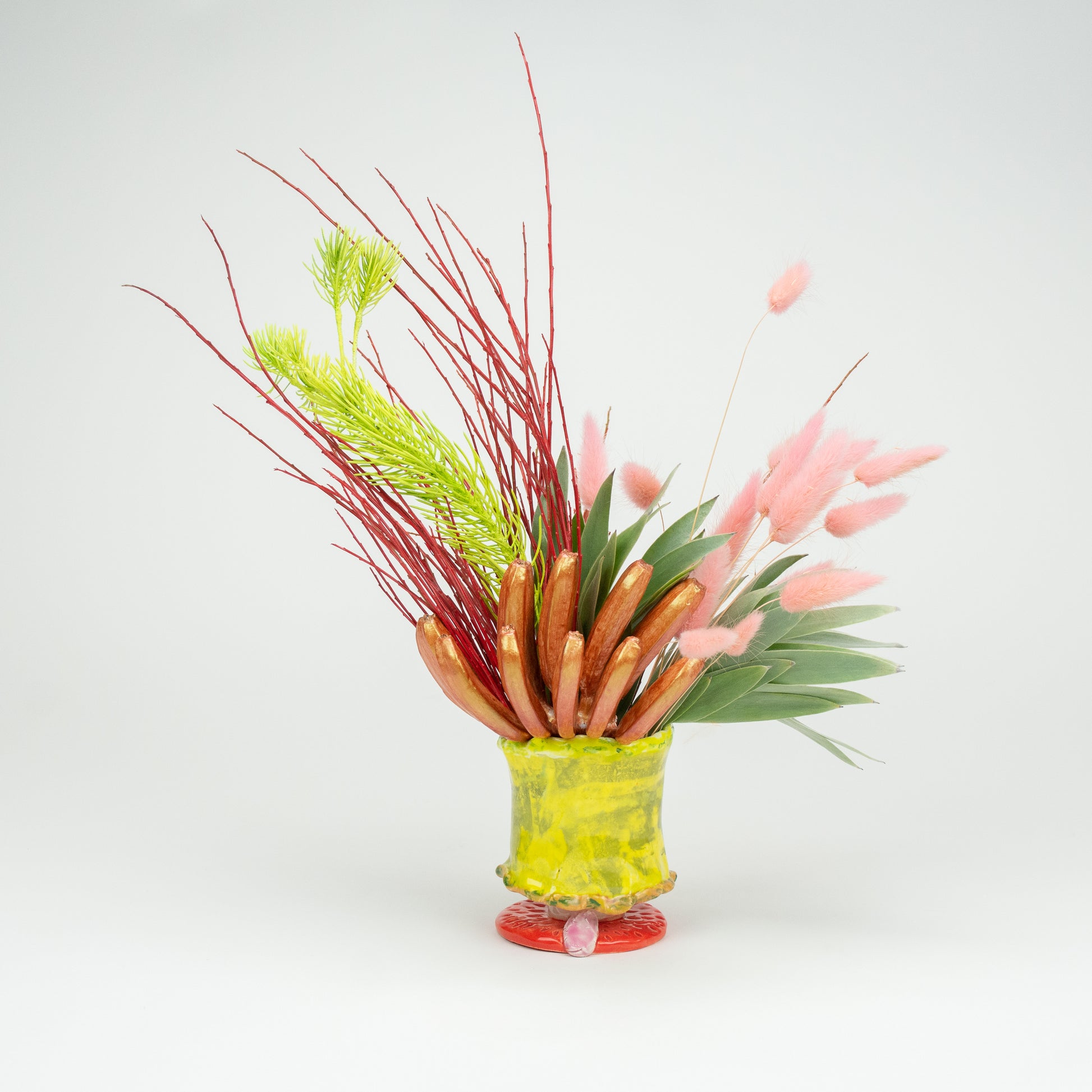 An everlasting floral arrangement built from altered plant materials, intentionally designed to complement the vessel it exists in. Each vessel is created utilizing different clay materials, glazes, multiple firing temperatures and building techniques. Together the preserved elements play, creating intriguing, new, silhouettes and ultimately, one activated sculpture.
