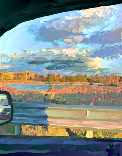 This roadside vista elevates an ordinary commute into a contemplative moment. Created in the artist's custom digital painting app using hand-drawn vector brushstrokes, the piece references a cell phone photo captured through a car window.