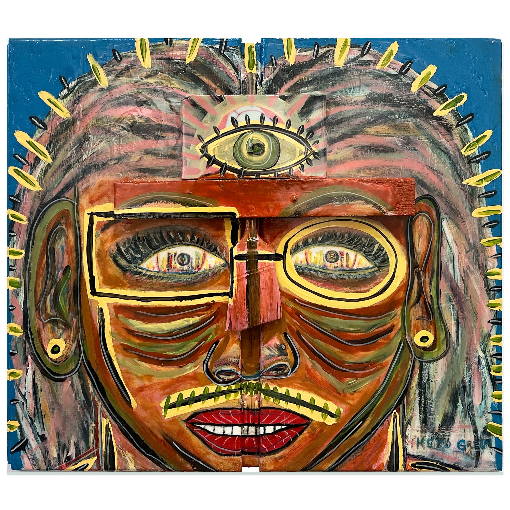 Acrylic, pastel, marker and crayon on wooden cabinet doors