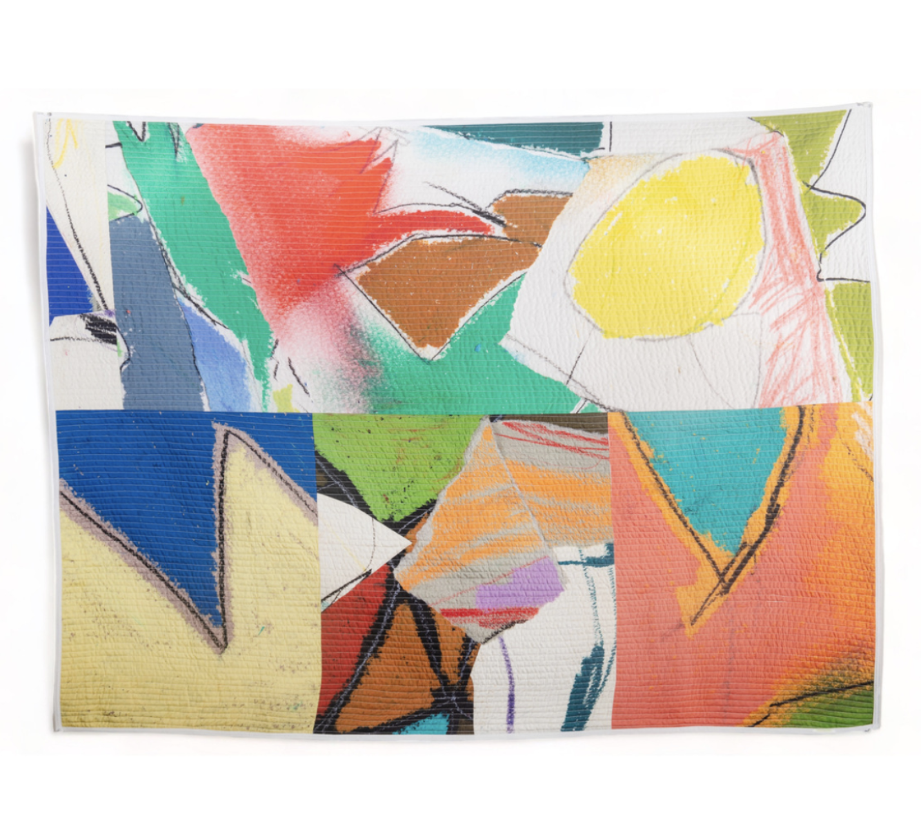 Julian J. Jones quilts made from images taken from the artist’s gestural, abstract drawings are inspired by traditional African American quilting. Combining custom textiles with solid fabrics, Jones’ works embraces and incorporates an aggressive mingling of colors, shapes, and forms as a result of pure artistic intuition. His works bridge drawing, sculpture, and textile to memorialize black culture. He communicates through the historical language of African American quilting by implementing abstract forms and vibrant colors in his works to bypass the viewer’s critical faculties and open a conversation around his Black experience.