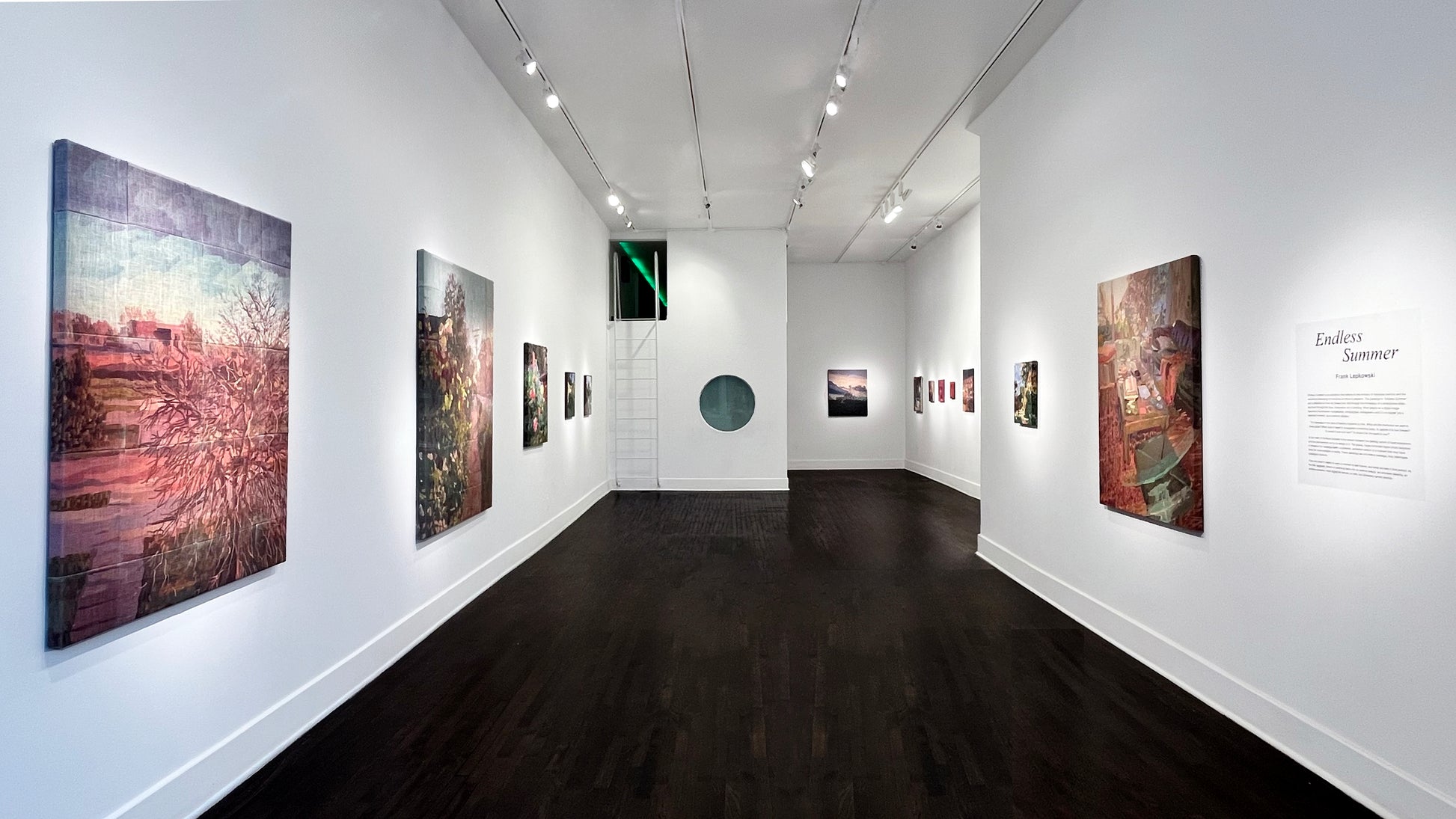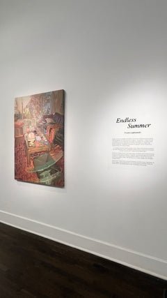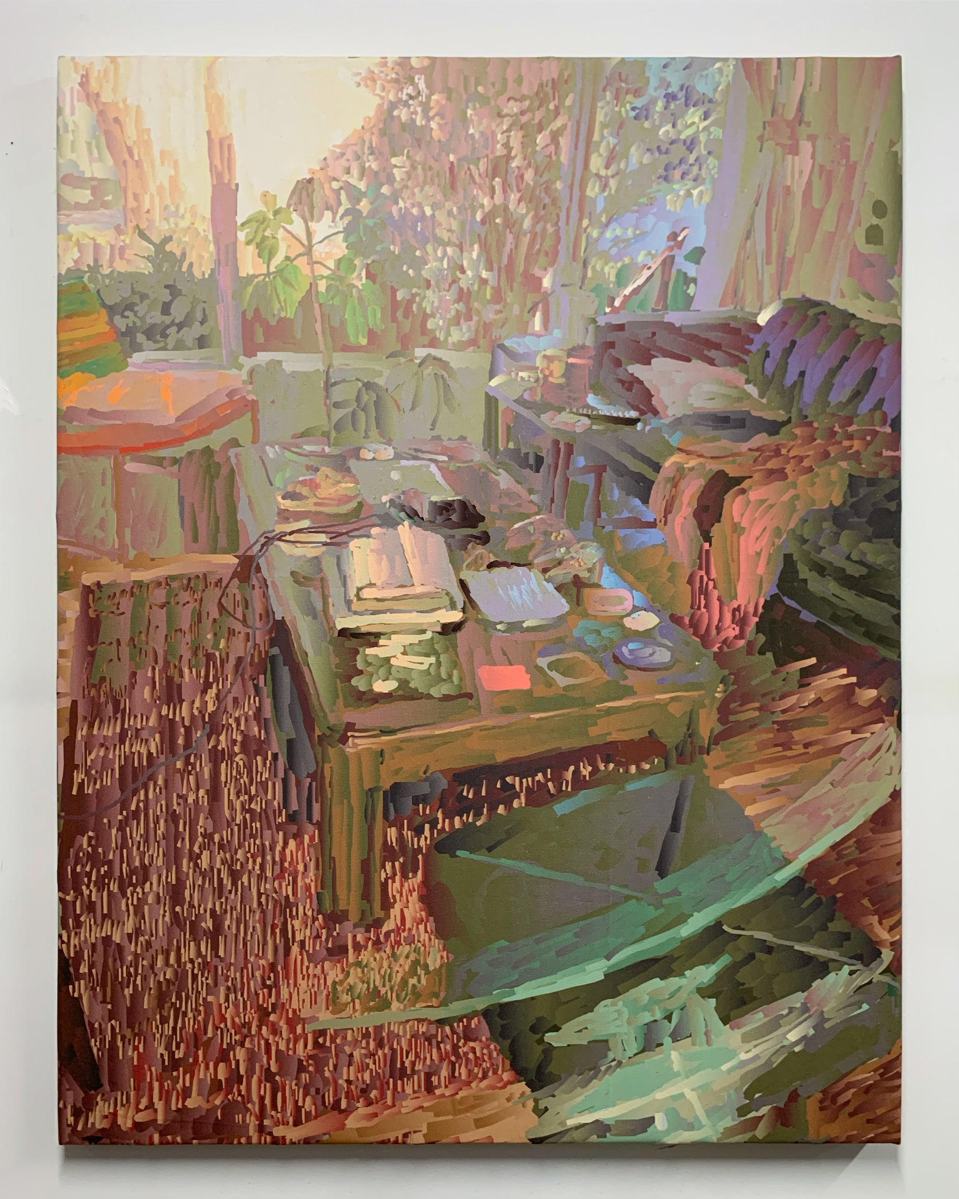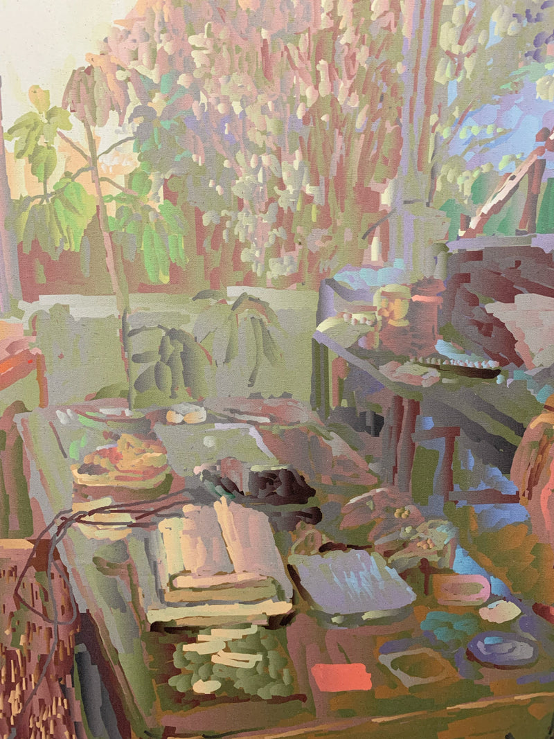Frank Lepkowski draws elements from the scene ebbing between photoreal details and softer, blocky strokes. Sunlight pours across the furniture, highlighting and color shifting small details. The painting invites close viewing, rewarding attention to surface, texture, and the emotional resonance of familiar spaces.