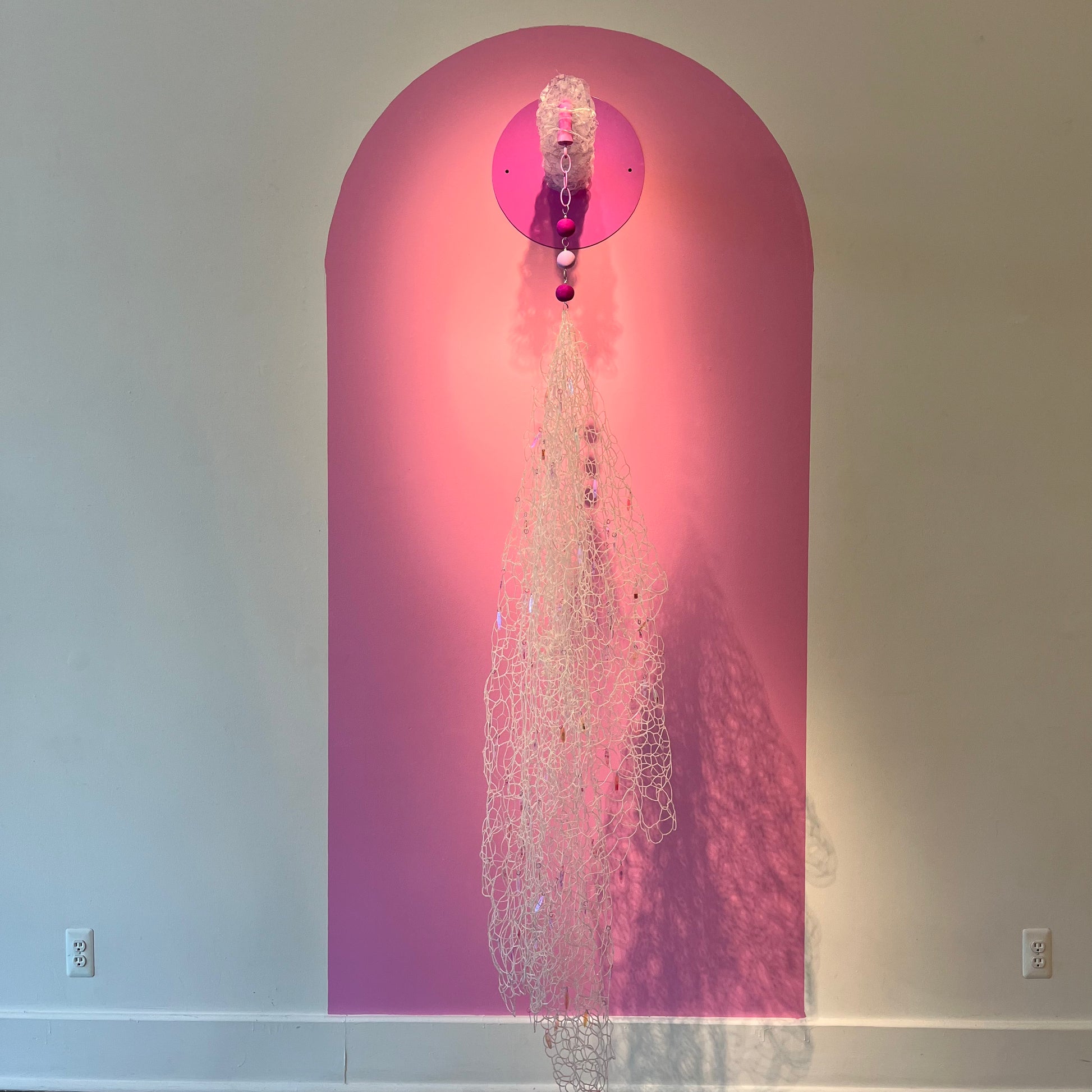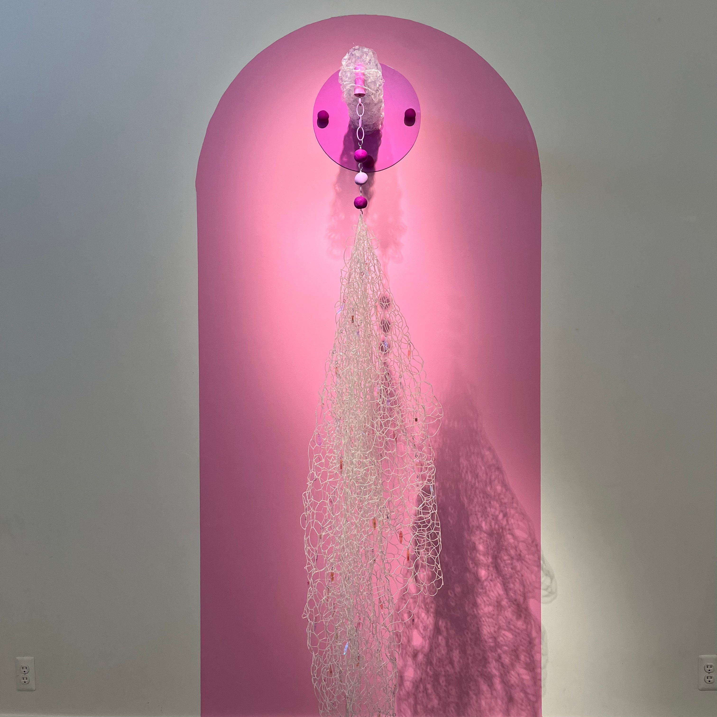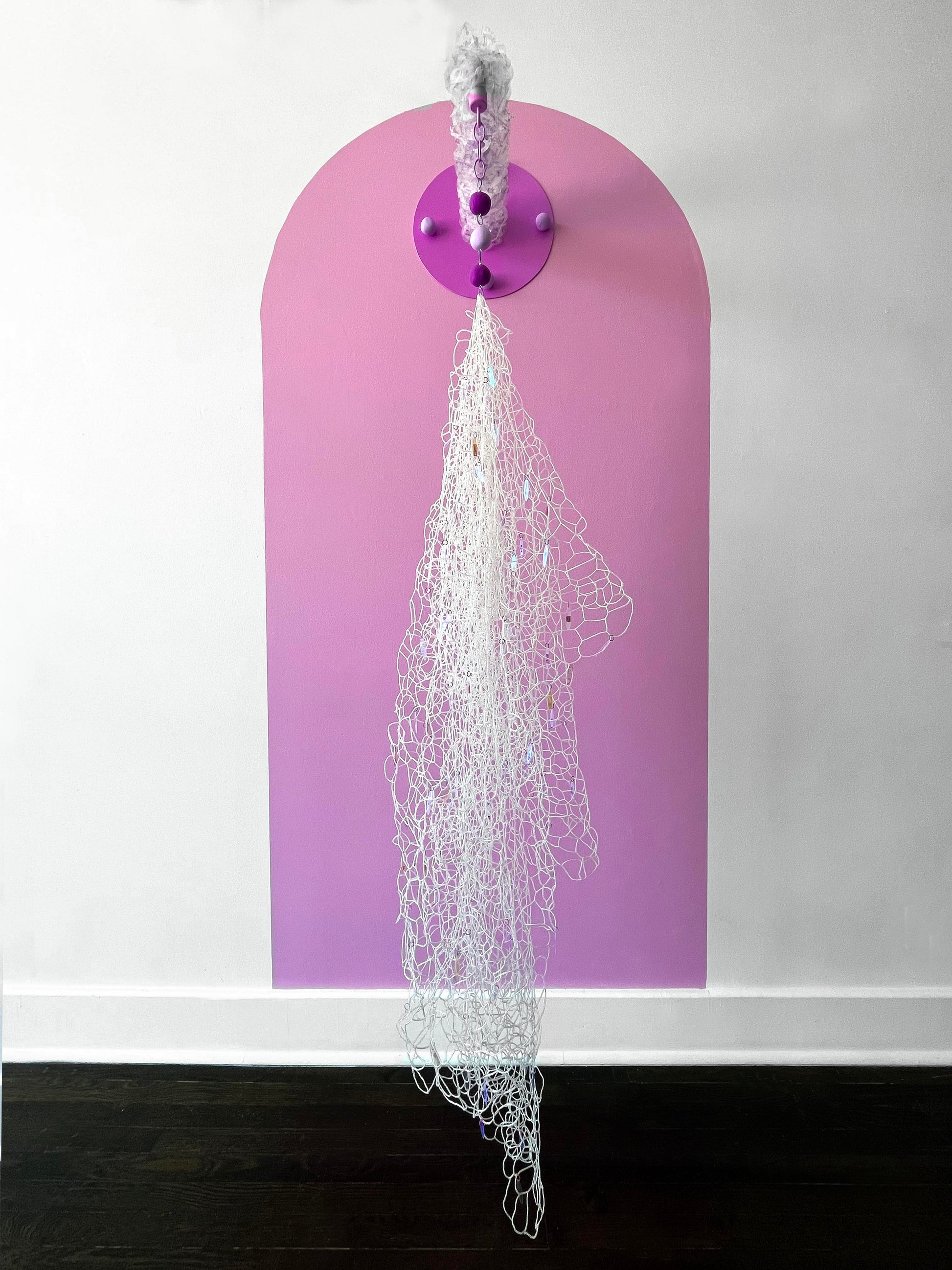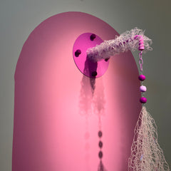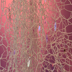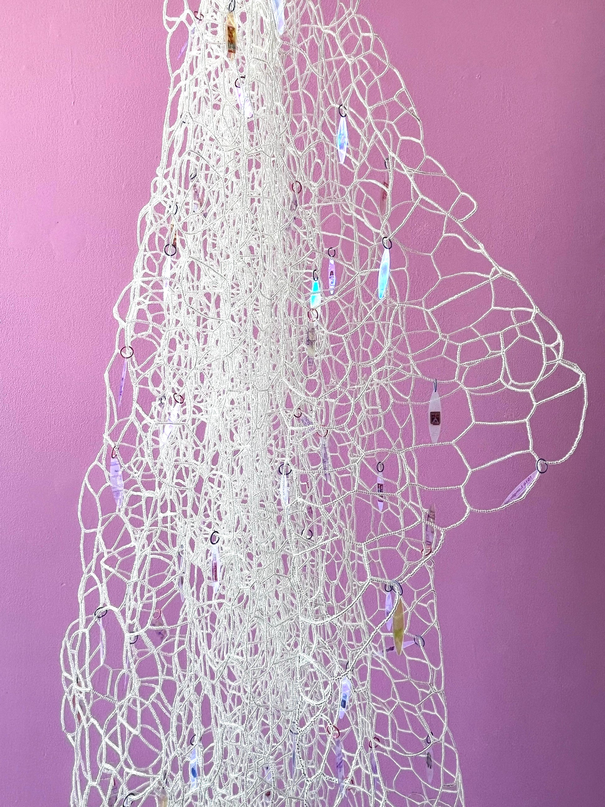 Glass seed beads, nylon thread, sublimation print on laser cut polyester, powder coated steel, jump rings, printed sequins, sculpy