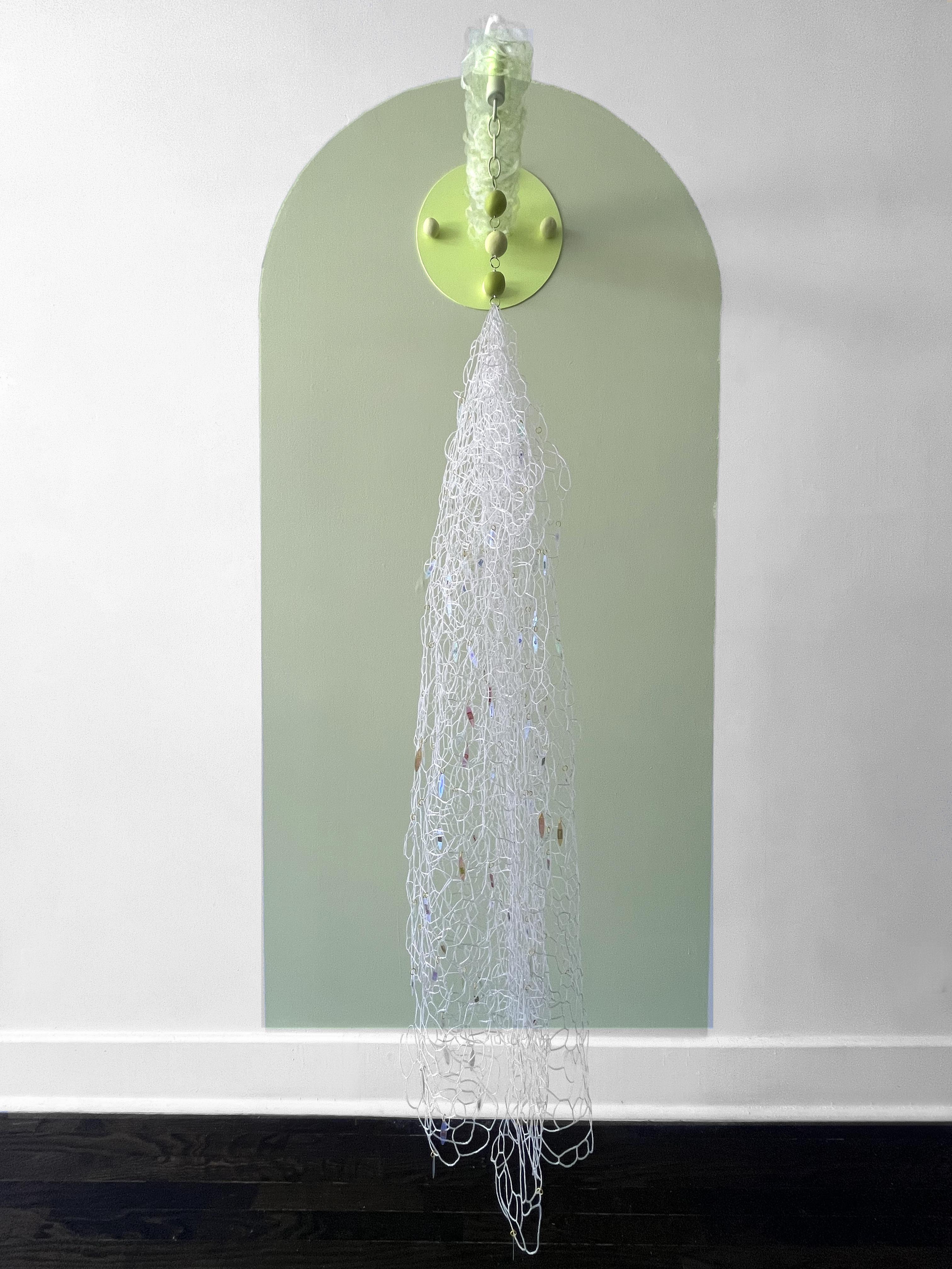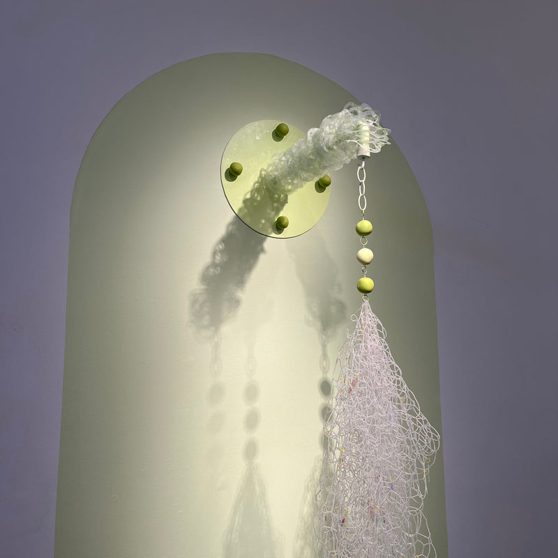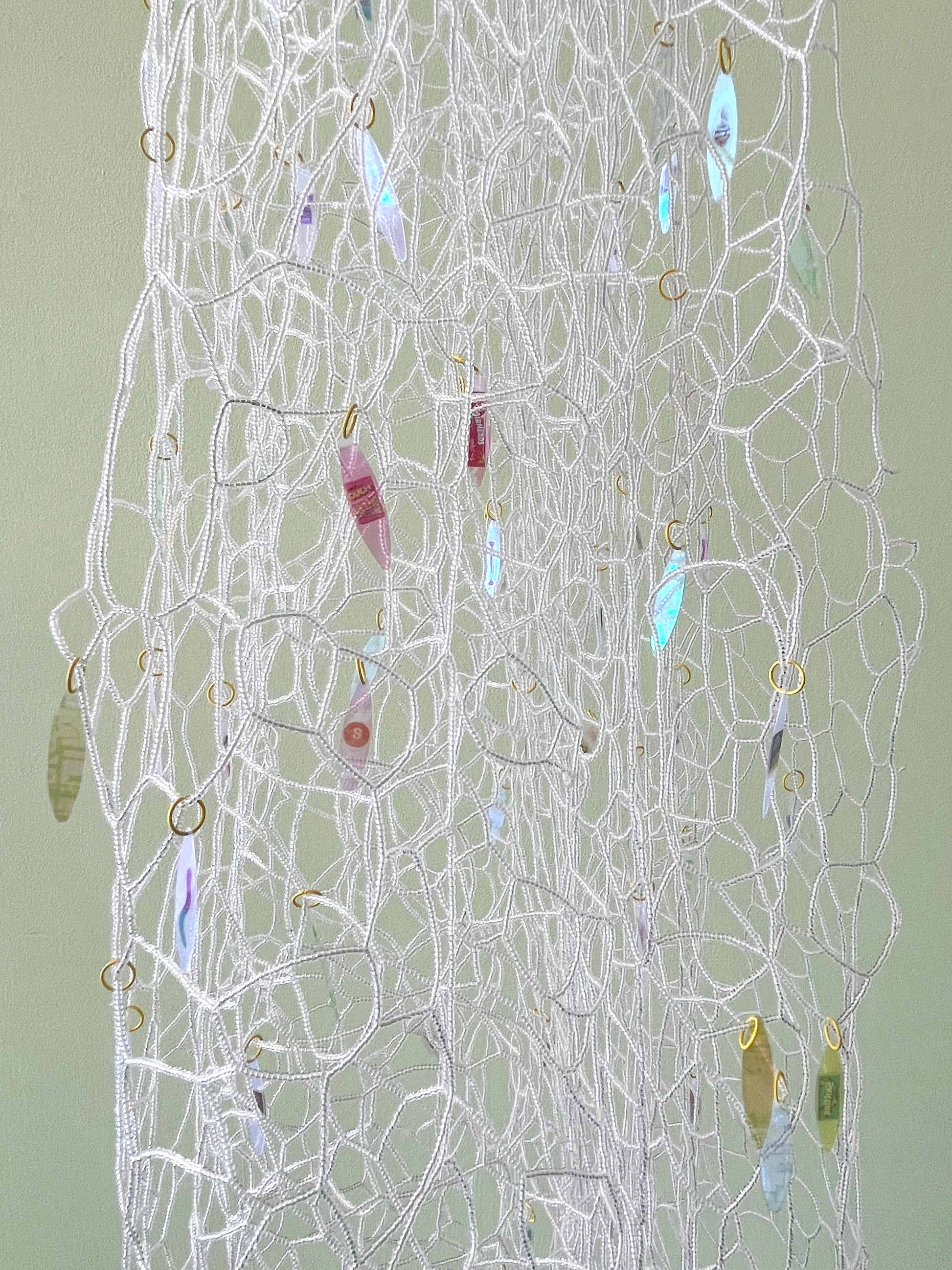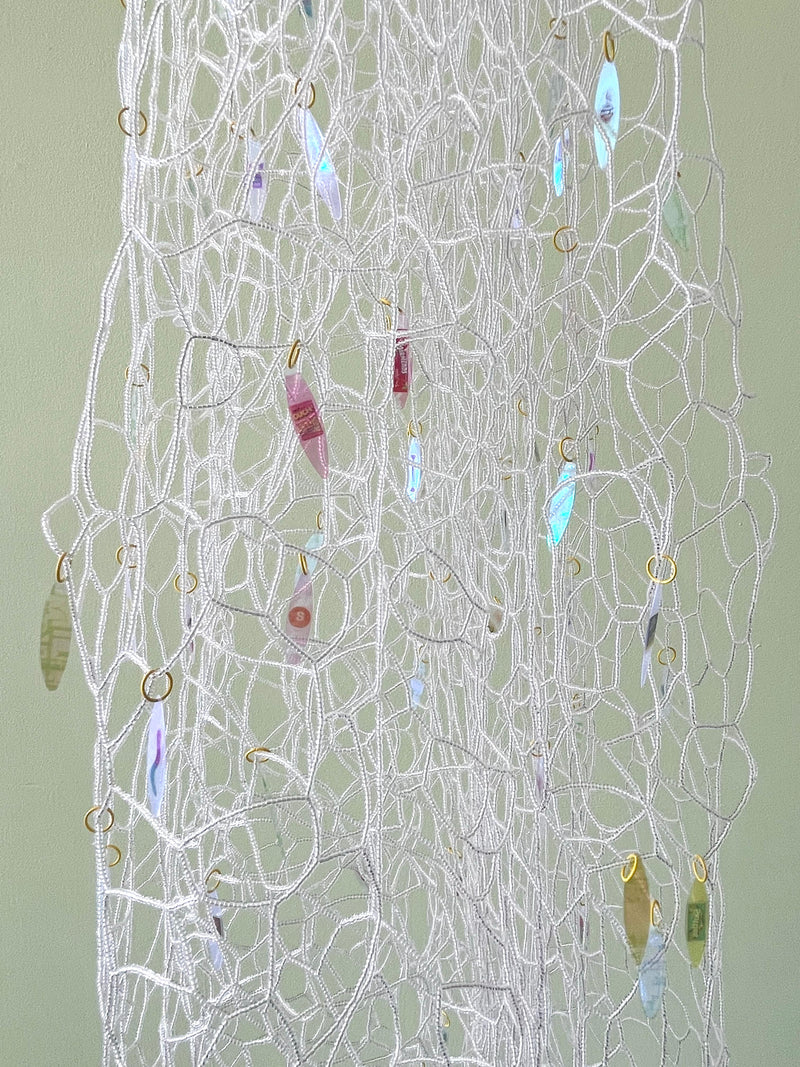 Glass seed beads, nylon thread, sublimation print on laser cut polyester, powder coated steel, jump rings, printed sequins, sculpy
