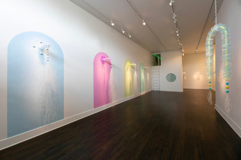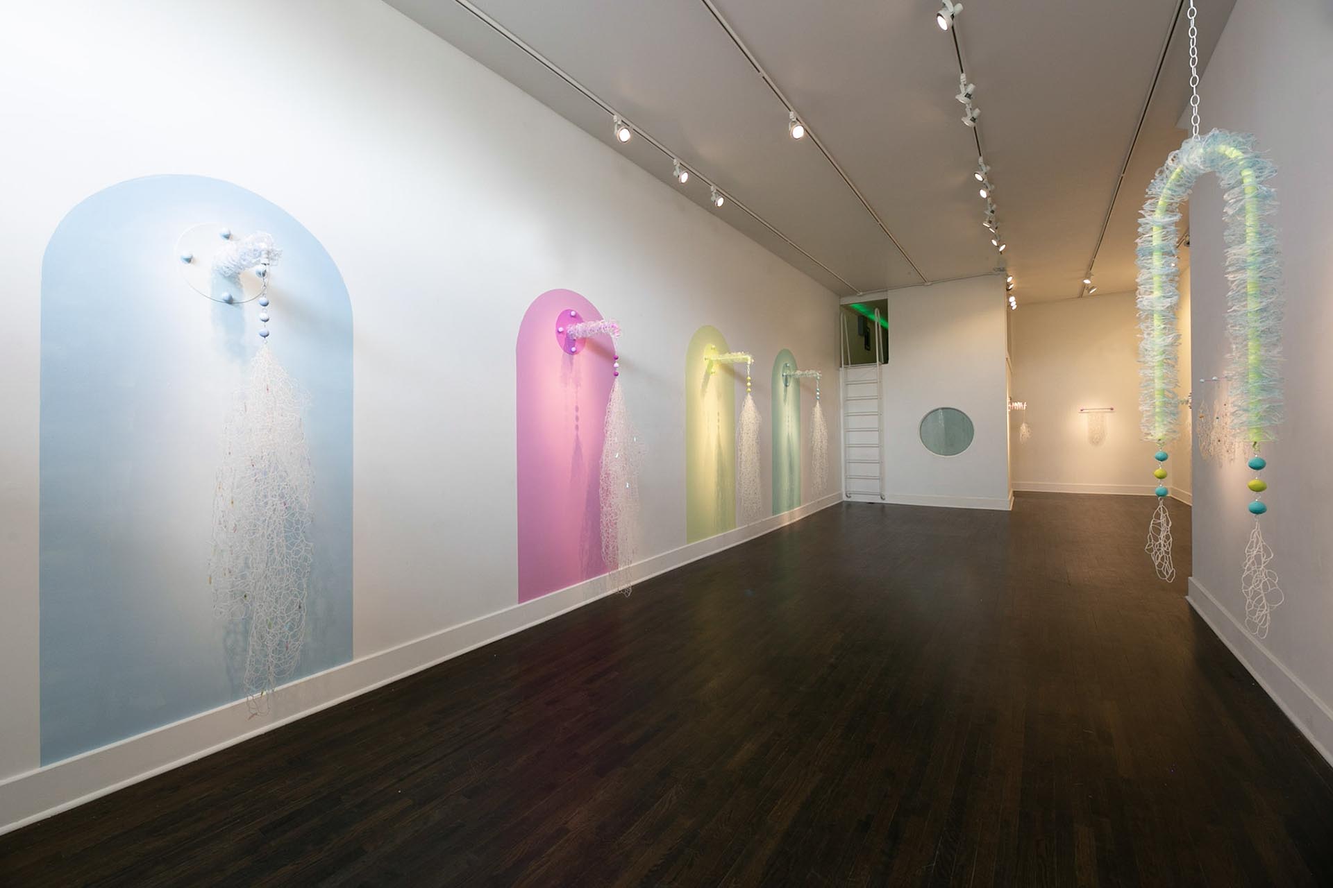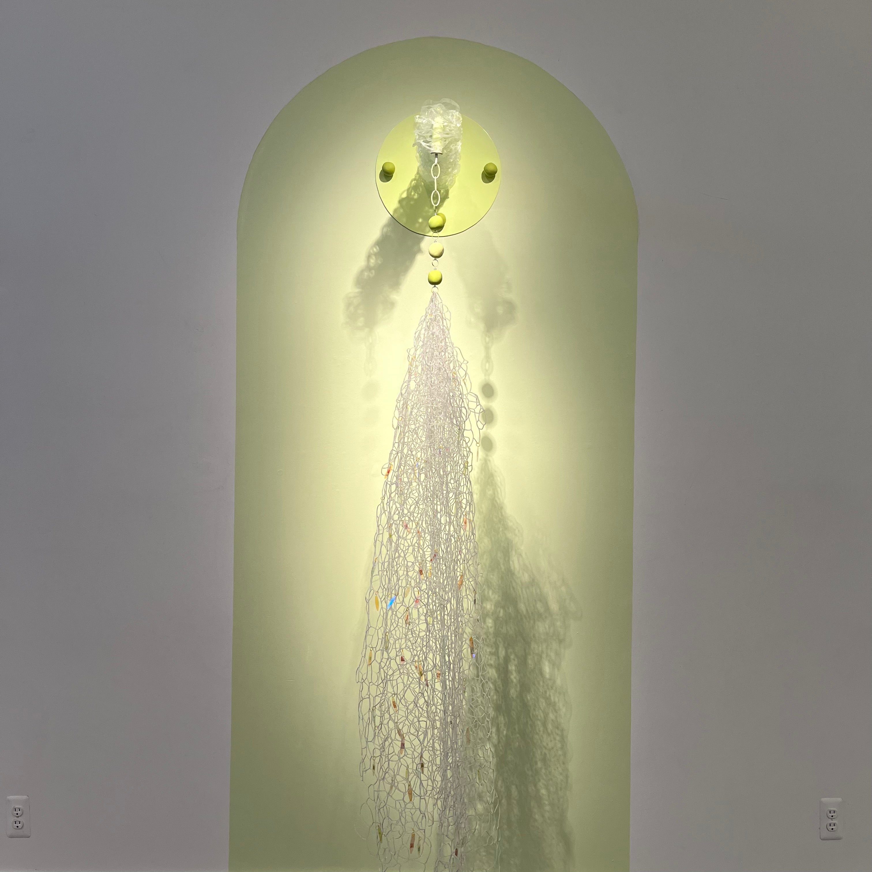 Glass seed beads, nylon thread, sublimation print on laser cut polyester, powder coated steel, jump rings, printed sequins, sculpy
