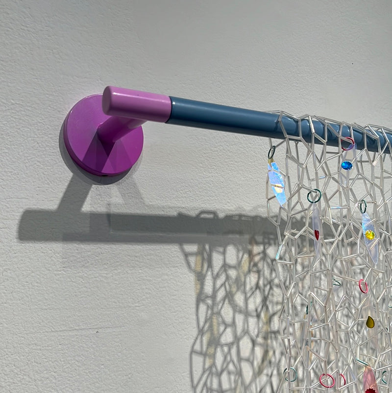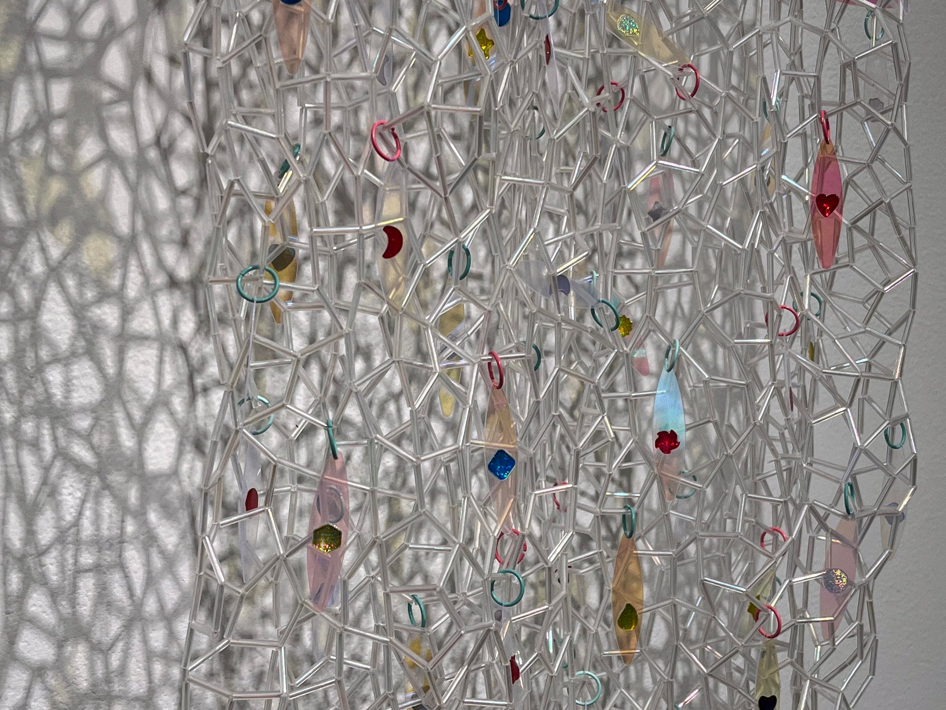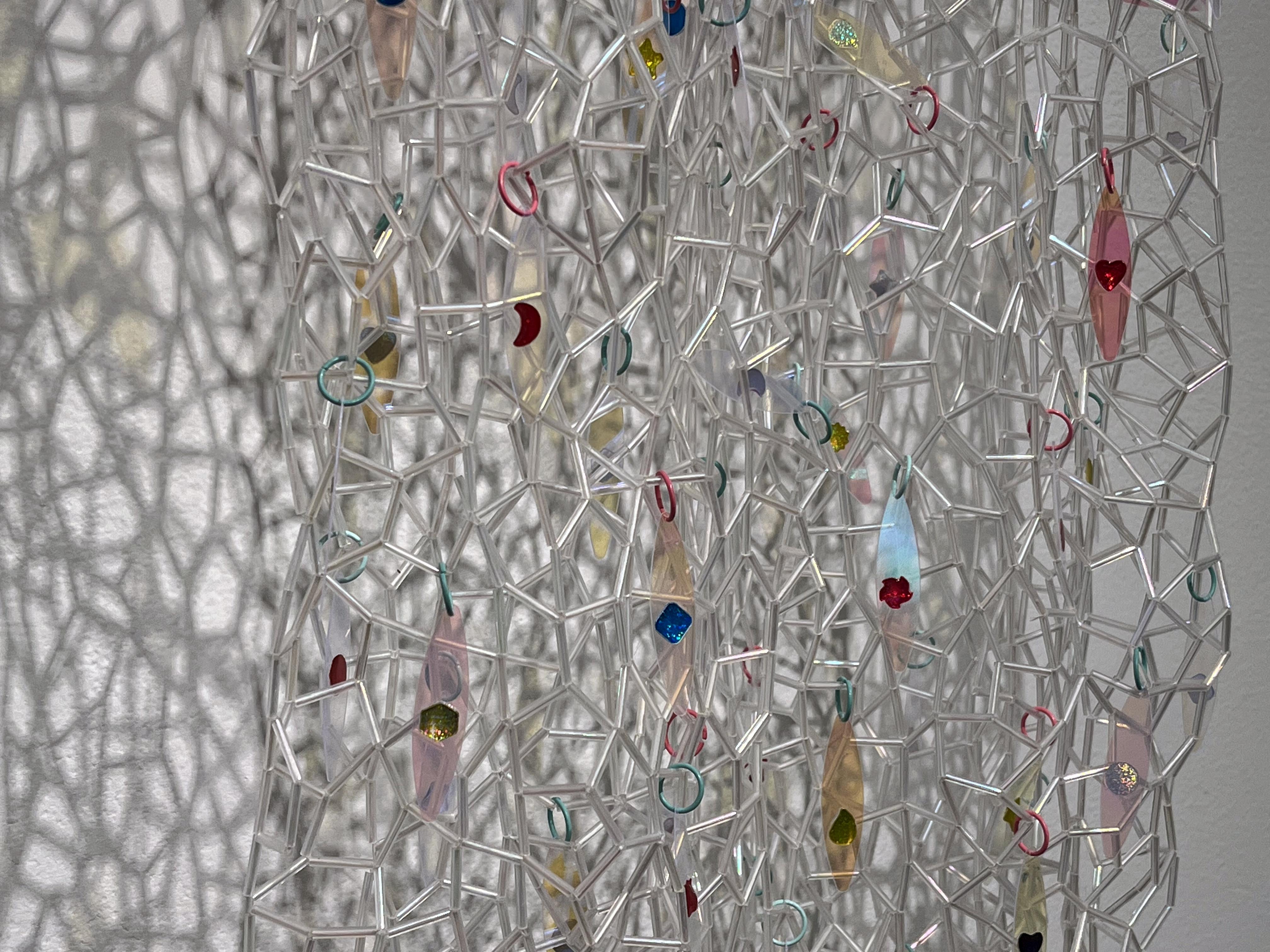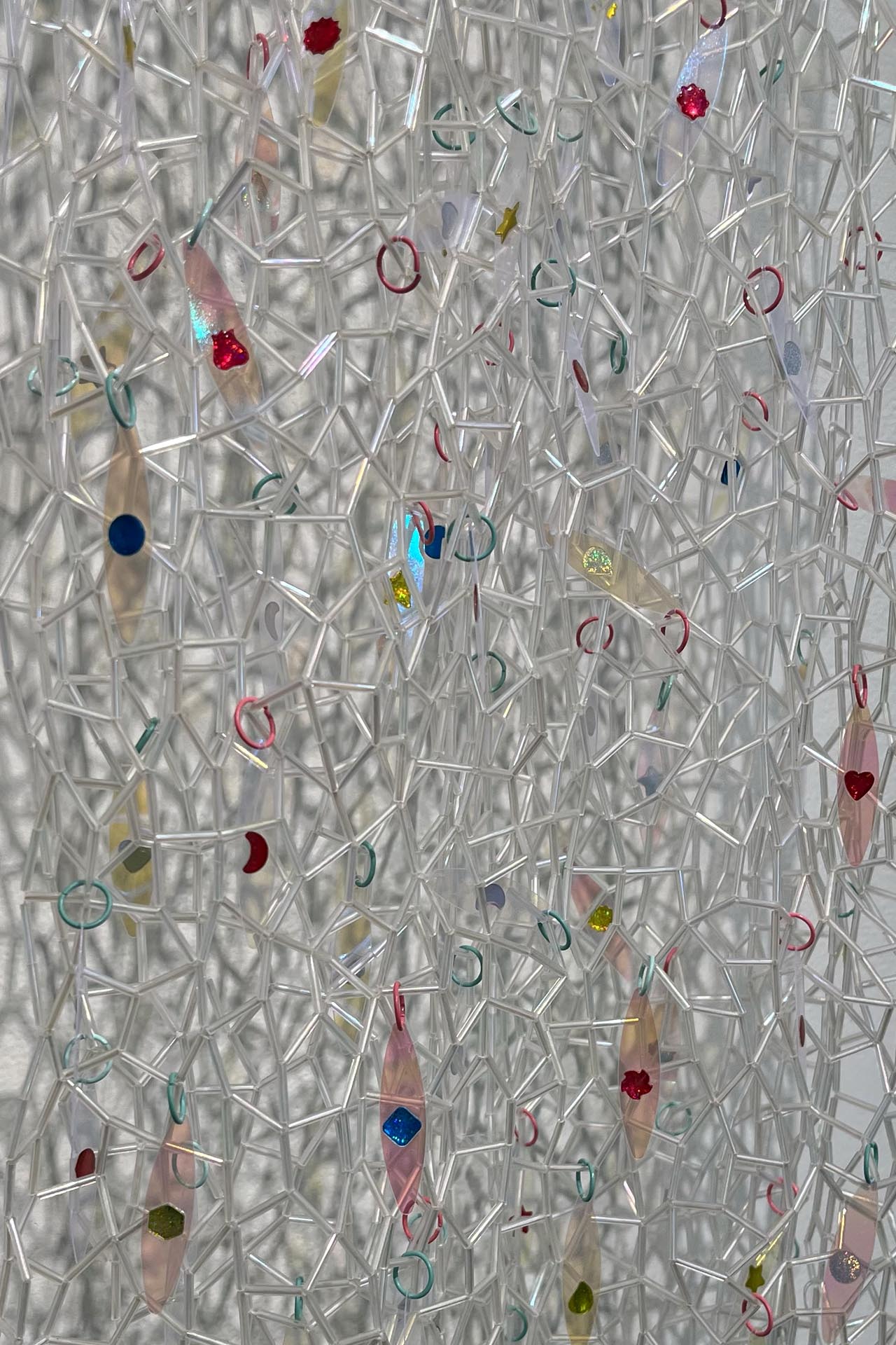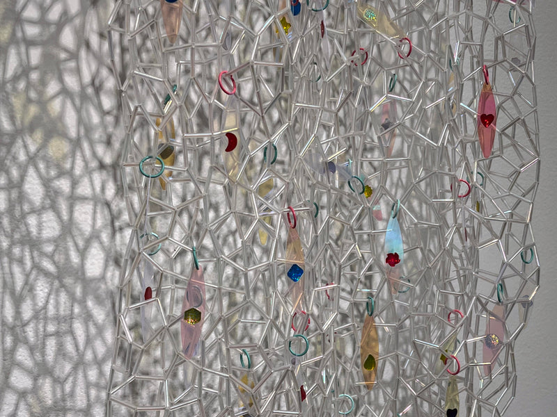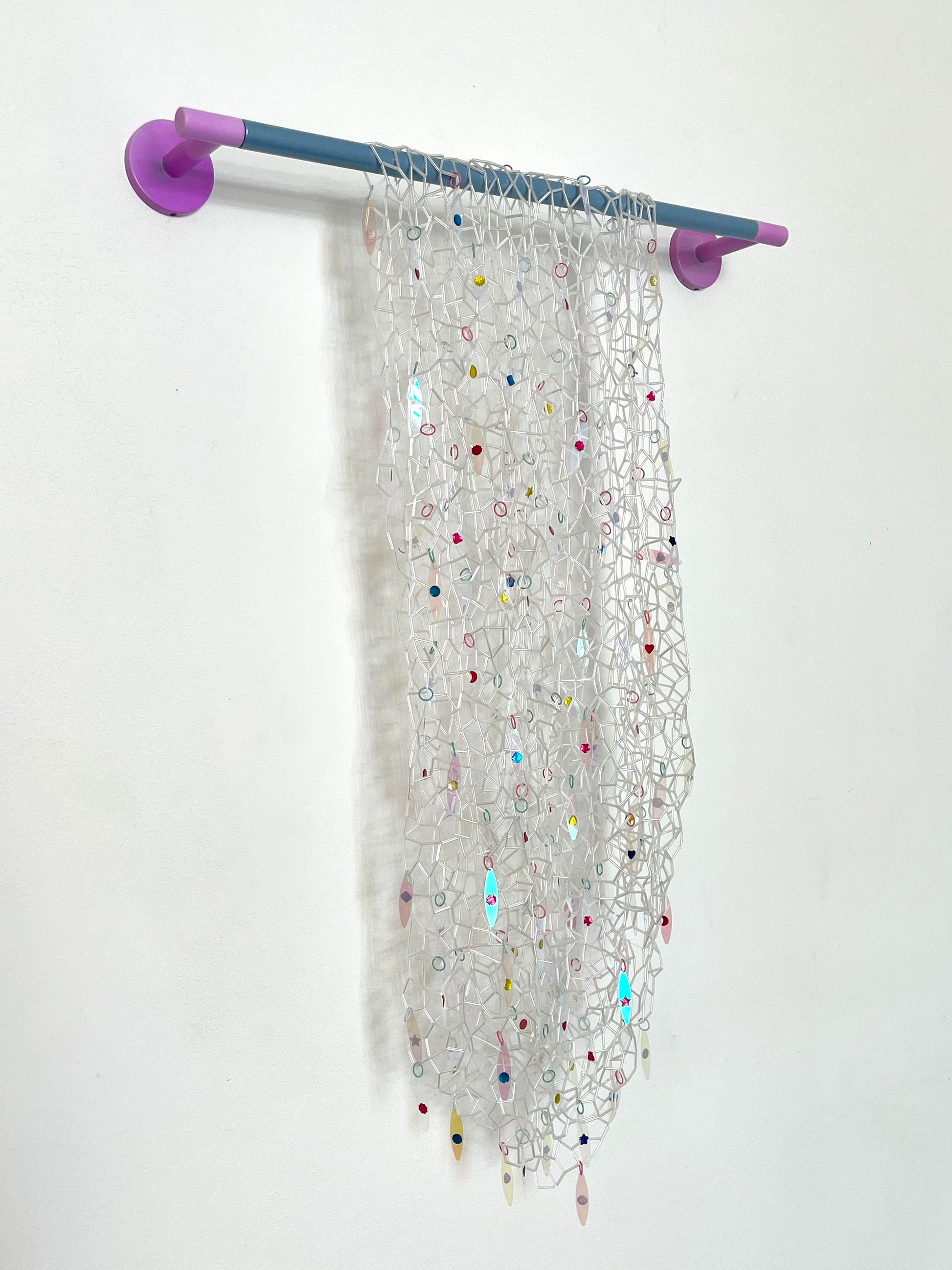 Glass bugle bead, nylon thread, powder coated metal, jump rings, sequins, sticker earrings, glue