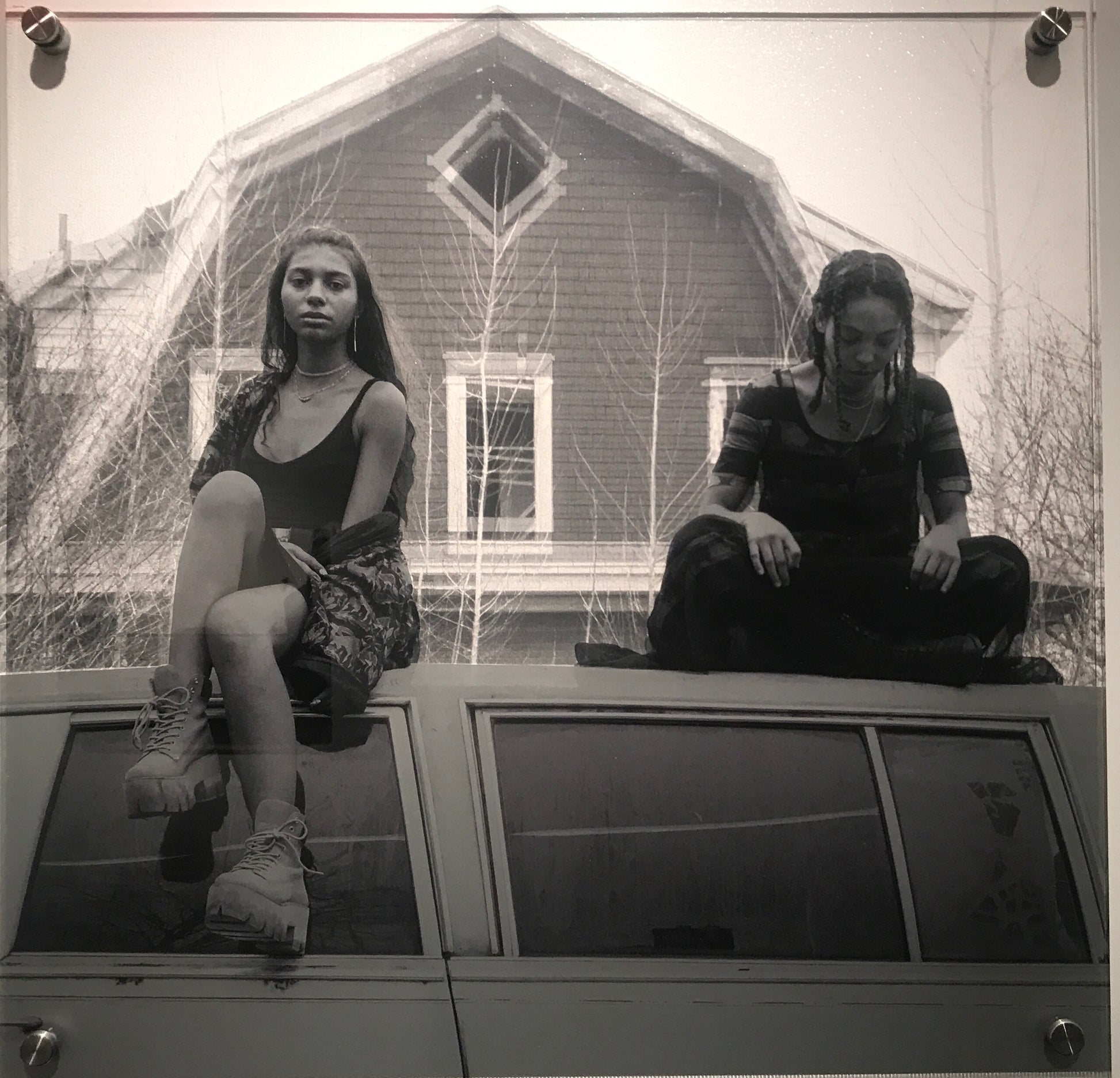 Photographic print on plexiglass, metal hardware, and acrylic paint on wood panel.