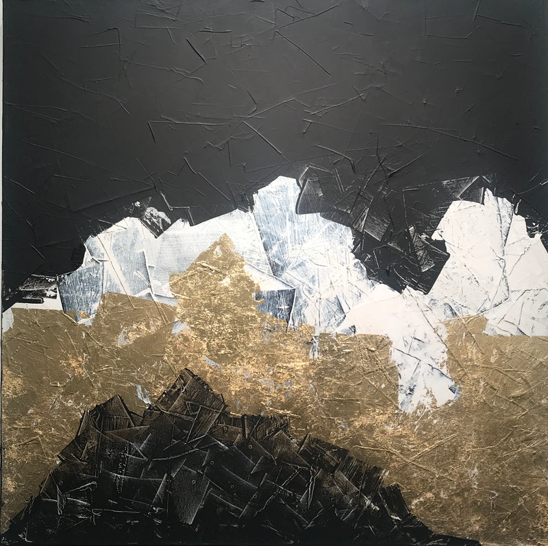 Acrylic paint, oil paint, gold leaf and leather on canvas.