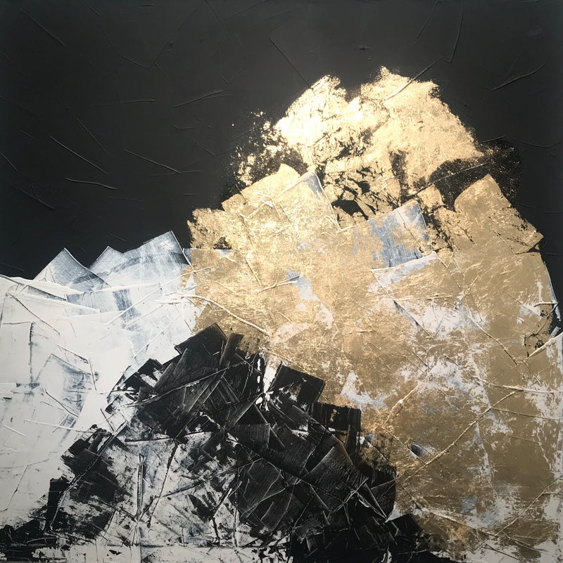 Acrylic paint, oil paint, gold leaf and leather on canvas.