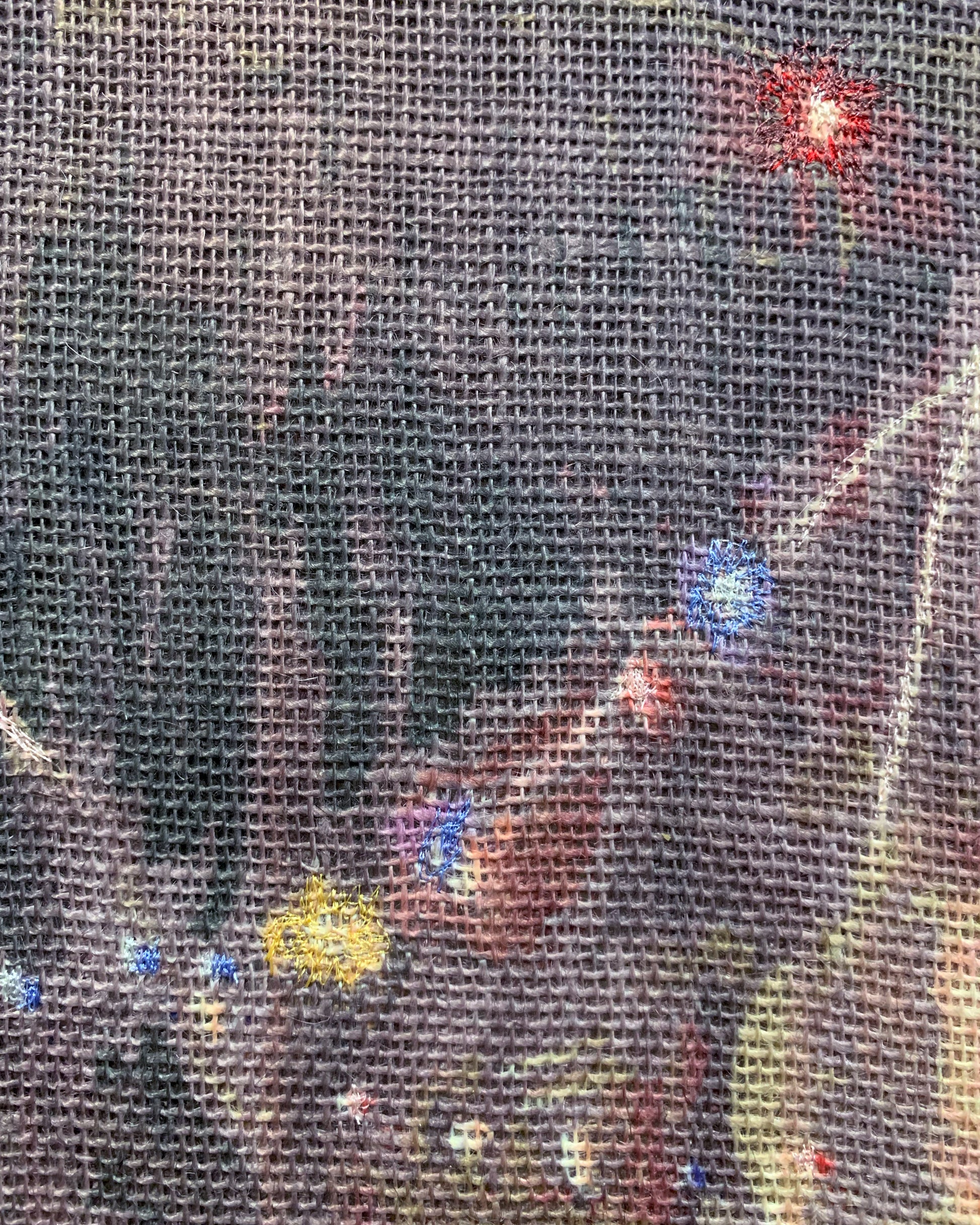 Dye transfer and free stitch embroidery on burlap