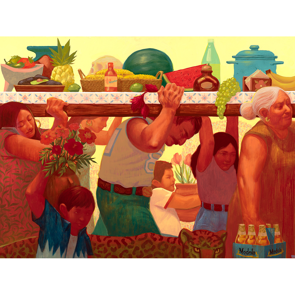 Inspired by family dinners in immigrant homes, "Setting of the Altar" depicts a family all working together in procession to set the dinner table. The recipes and ingredients they carry act as offerings to a culture and place that is far. In gathering around the dinner table, they offer a moment of presence, they pay reverence to their culture and each other.