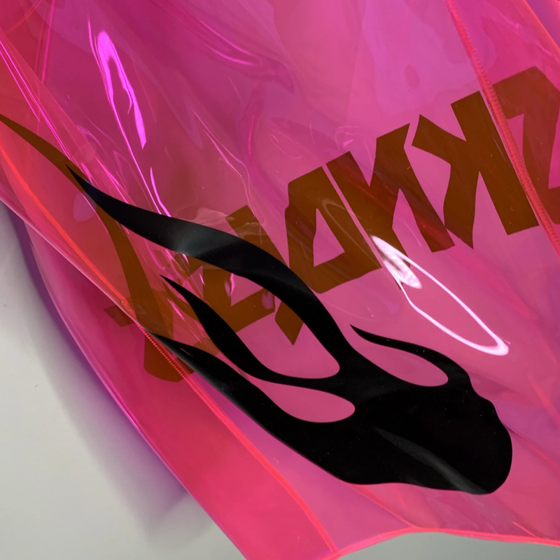 Pink clear PVC Tote Bag screeenprinted with flames.