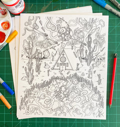 SPACES is an advanced coloring sheet project that was started in 2017 and completed in the spring of 2020. Individual, unique and oversized sheets depict different spaces that range from a plant shop storefront to an alien world covered in cacti to an urban loft filled with artwork, furniture and of course, plants.