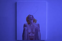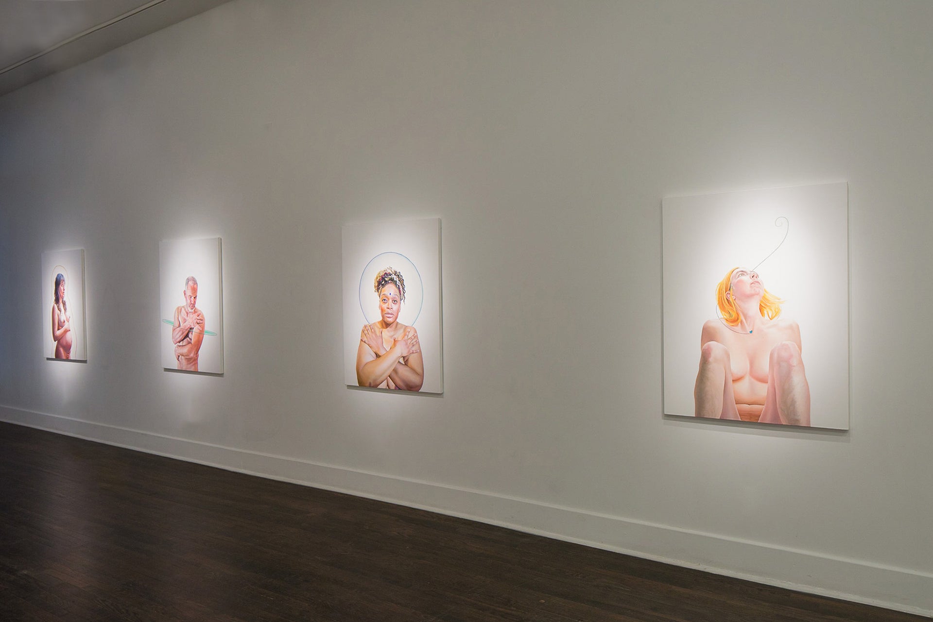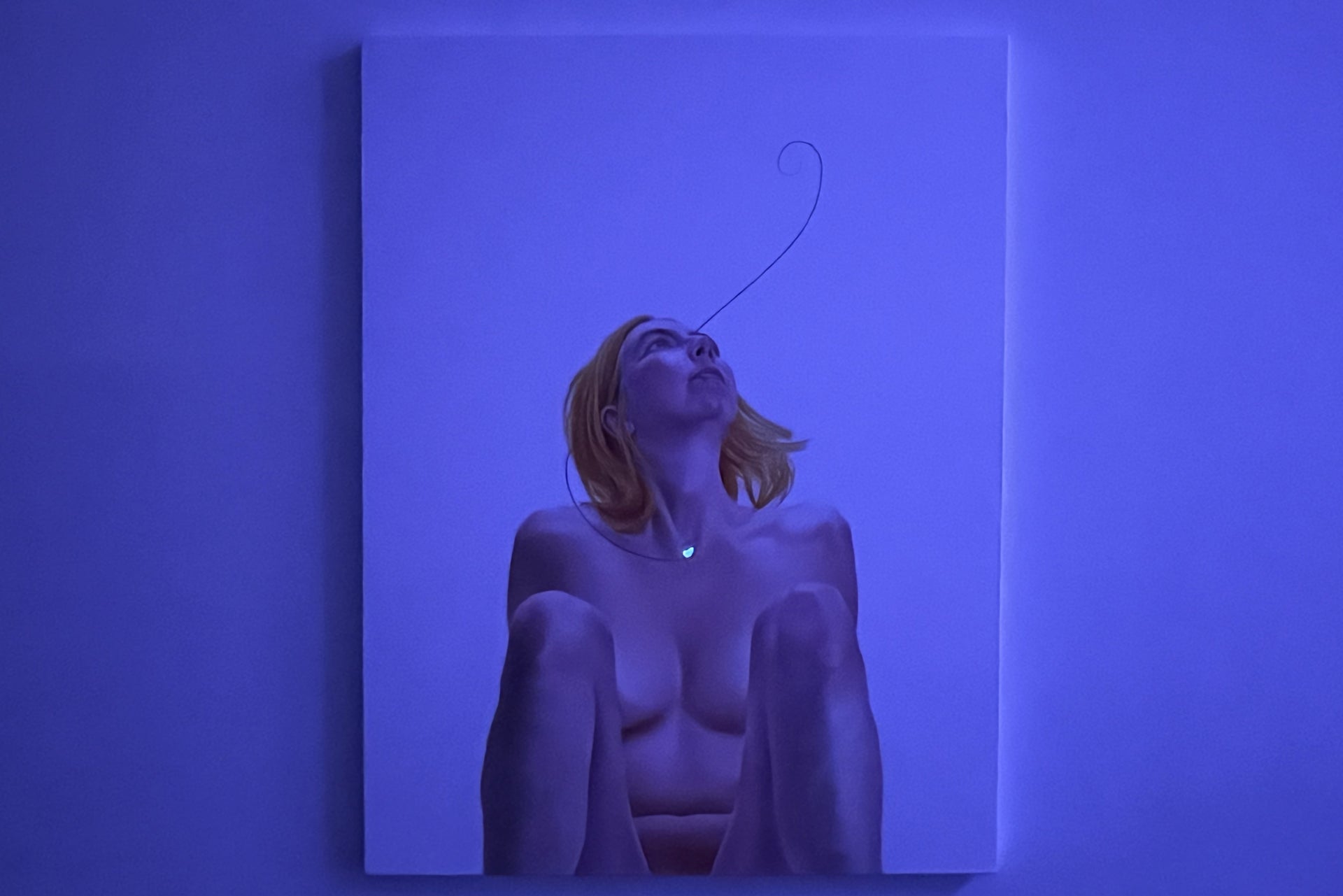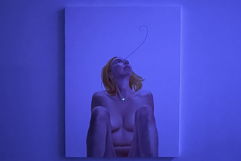Oil, acrylic, and light on canvas, board, and resin, light board, USB wall charger, and optional battery pack.