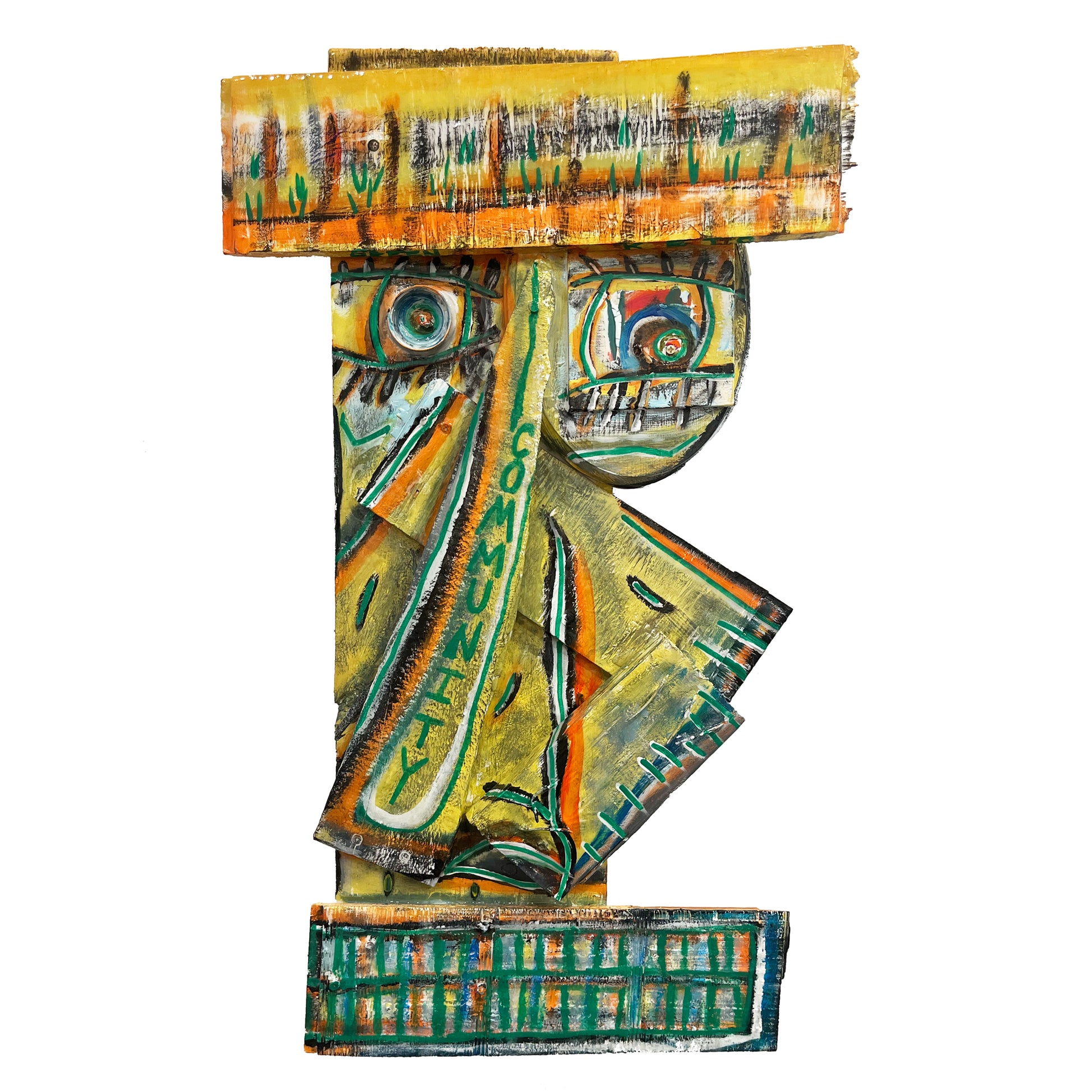 Acrylic, oil pastel, nails on wood